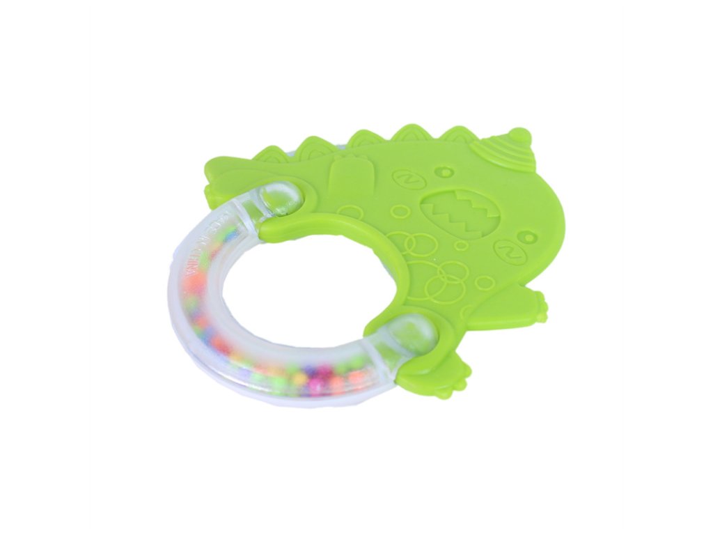 Barevné chrastítko půlkruh s drobnými barevnými kuličkami uprostřed a zelené kousátko ve tvaru dinosaura v jednom, jsou určeny pro ty nejmenší. S tímto praktickým kouskem si děťátko zaručeně vyhraje a navíc si rozvine motorické a zrakové dovednosti. Kousátko zároveň pomůže ulevit při růstu zoubků. Díky úzkému tvaru se vleze do dětské ručičky. Půlkruhový tvar s velkým množstvím drobných kuliček způsobuje, že chrastítko chrastí i při sebemenším pohybu, ale díky drobným kuličkám má opravdu jemný chrastivý zvuk. Je vhodné od narození, ale z důvodu zručnosti dětí doporučeno pro děti od 3 měsíců.