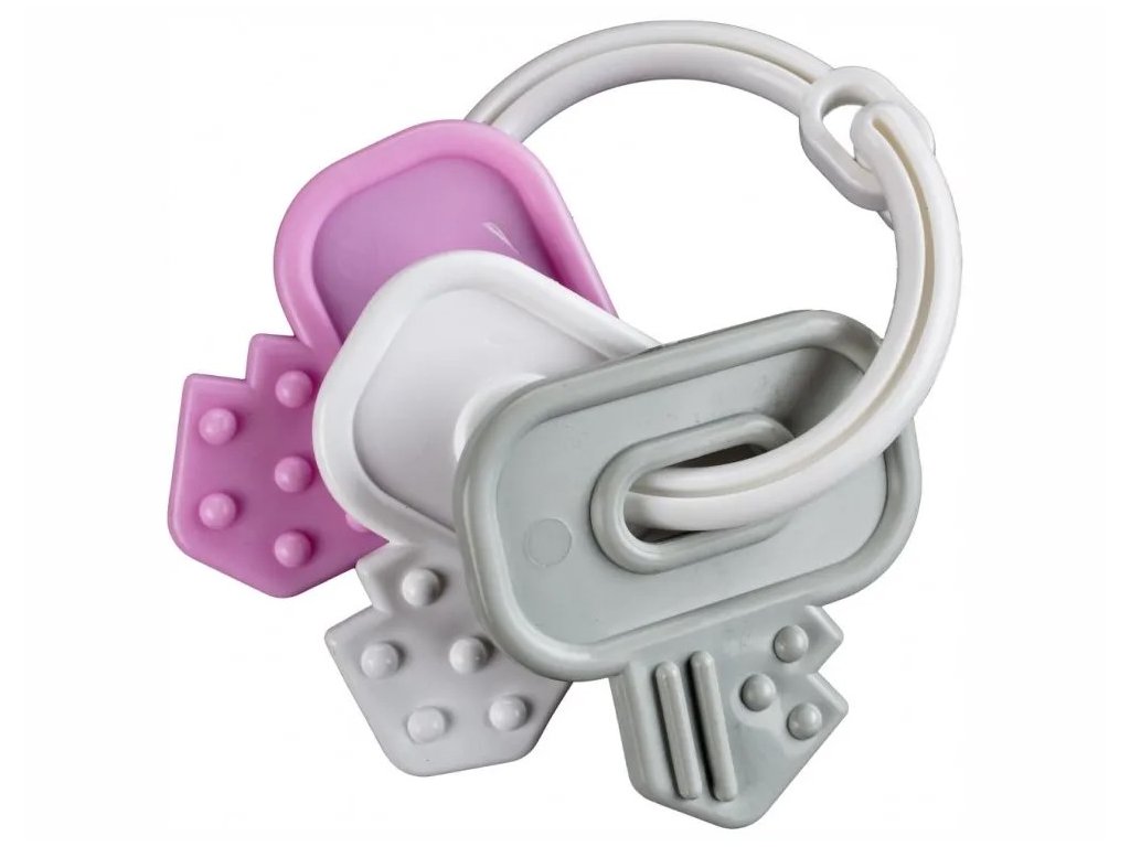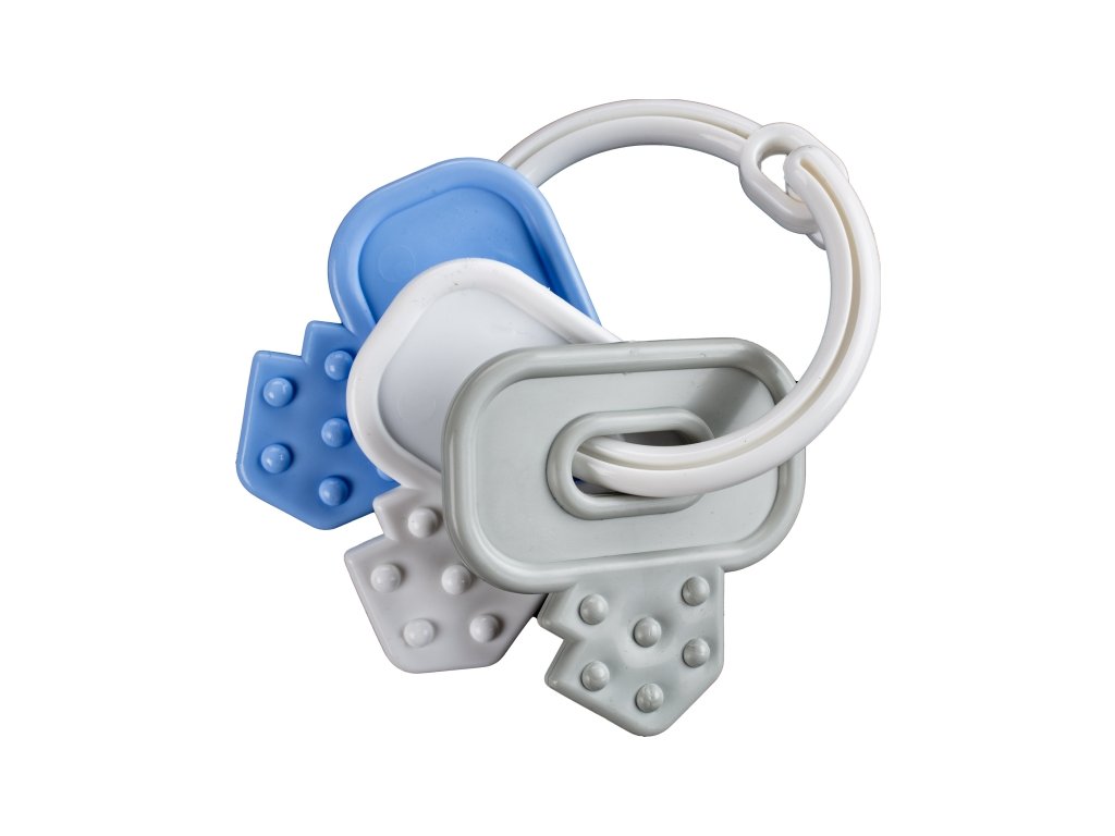 Veselé chrastítko se třemi plastovými přívěšky klíči je určeno pro ty nejmenší. Tento praktický kousek navíc rozvíjí motorické a zrakové dovednosti děťátka. Miminka často používají klíče jako kousátka. Kombinací chrastítka a kousátka vznikne aktivní hračka, která naučí vaše dítě lépe zpracovávat podněty a uvědomovat si své okolí. Chrastítko bude rozvíjet smysly vašeho miminka a kousátko mu uleví od bolesti při růstu zoubků. Má krásný vzhled, je lehké a stimuluje dítě vizuálně i prostřednictvím hmatu.