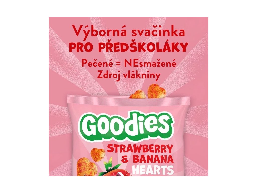 Goodies křupky srdíčka banán a jahoda obsahují samé dobré ingredience. Jsou to jsou hravé křupky obalené v prášku z mrazem sušeného ovoce. NEsmažené křupky jsou skvělým zdrojem vlákniny a navíc bez přidaných cukrů a soli. Zábavné tvary srdíček a báječná chuť, která bude děti bavit. Balení je vhodné jako křupavá svačinka během dne, na výlety i do dětských svačinkových boxíků. Perfektní volba bez kompromisů pro děti od 3 let (i rodiče).