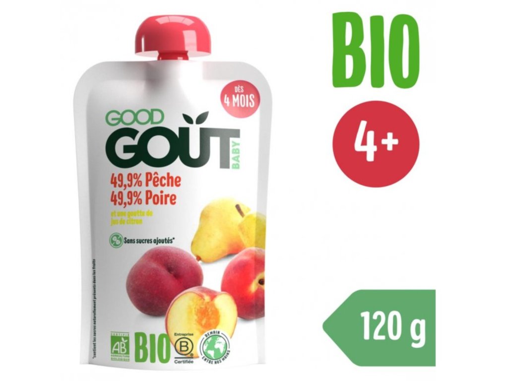 Složení: 50 % Bio broskví, 50 % Bio hrušek, Bio citronová šťáva. Bez lepku.