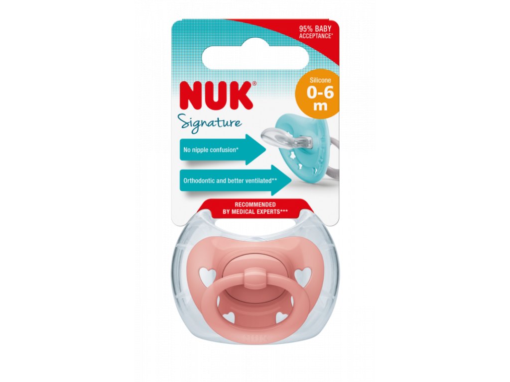 Dudlíky NUK® Signature reagují na potřebu přirozenosti svým zcela přirozeným tvarem. Tvar dudlíku připomíná tvar matčiny bradavky během kojení, tudíž podporuje zdravý vývoj úst miminka. Je dokázáno, že přirozené sání zajišťuje nejen příjem potravy, ale také podporuje rozvoj důležitých schopností, jako je správný způsob polykání, žvýkání či mluvení.