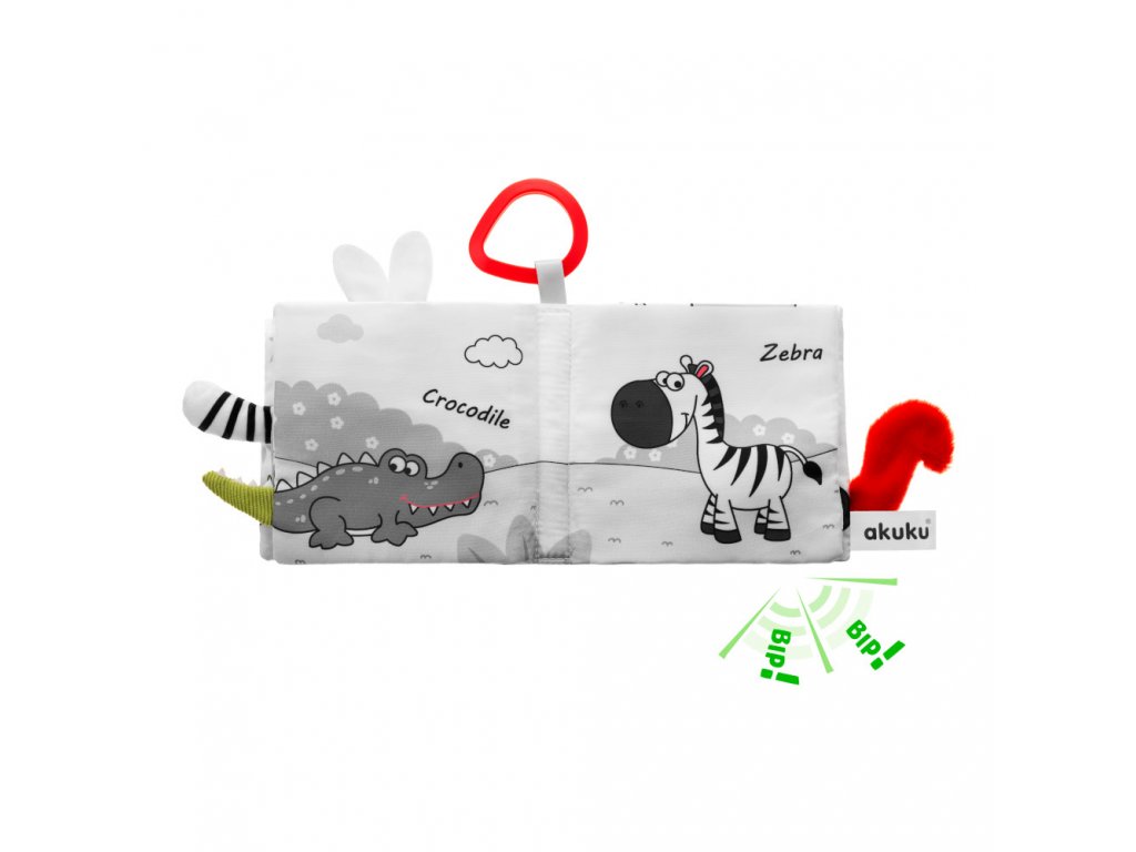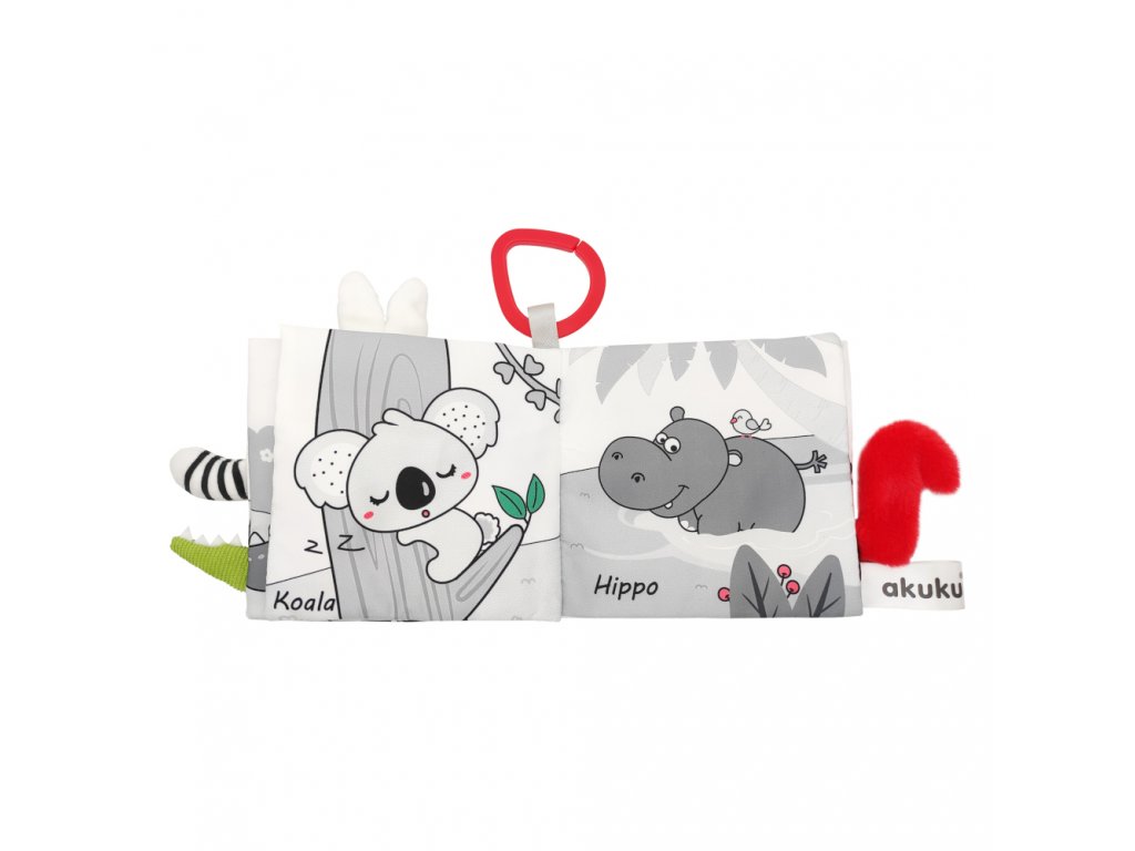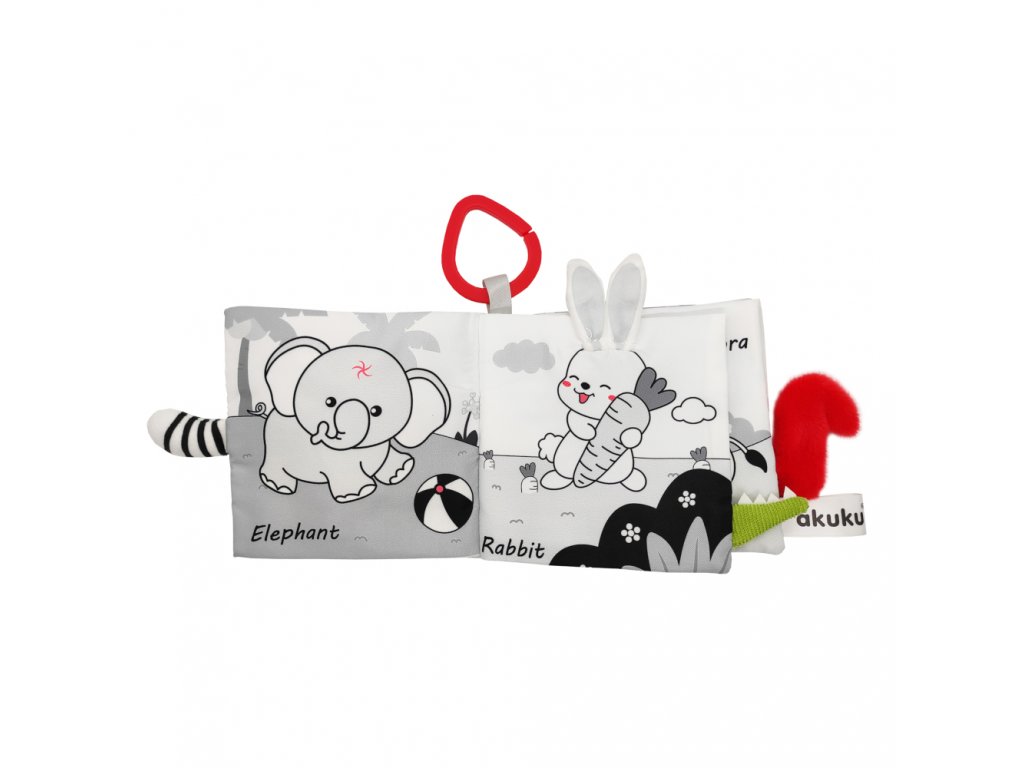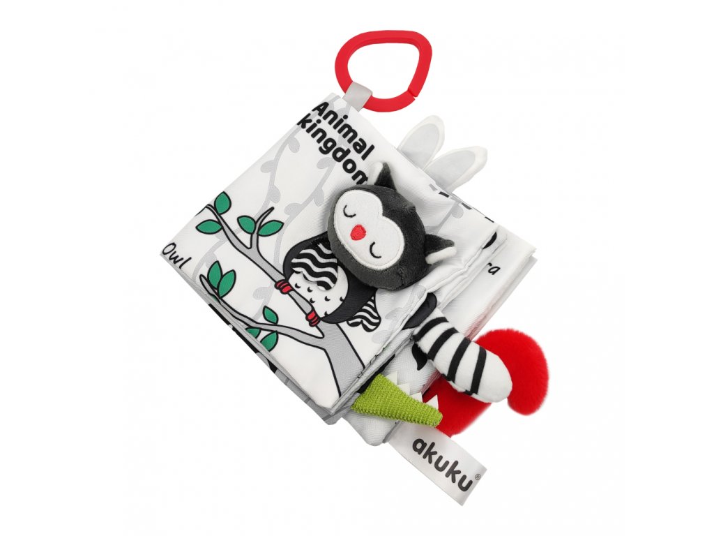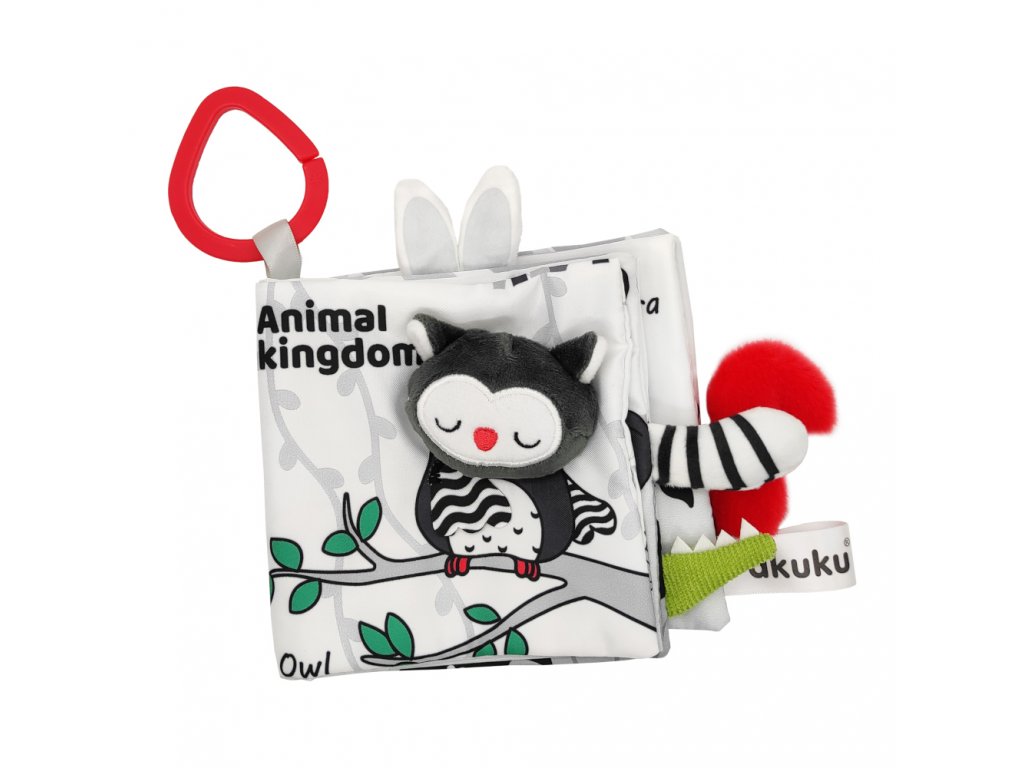 Kontrastní smyslová knížka Království zvířat je skvělou hračkou pro nejmenší děti, které se teprve učí poznávat svět. Je plná překvapení, která vašeho nejmenšího zaujmou. Stimulace hmatu ovlivňuje správný a harmonický vývoj vašeho dítěte. Najdete zde materiály s různou texturou a vlastnostmi, jako je pískot, chrastítko, šustivé prvky a četné výstupky. Hračka podporuje vývoj miminka od prvních dnů a stimuluje zrak díky speciálně použitým barvám, které miminko vidí od narození. Dokonale stimuluje rozvoj zrakové, sluchové a pohybové koordinace dítěte. Je ideální pro učení se chápat a objevovat zajímavé zvuky a tvary. Praktický háček umožňuje připevnit hračku na kočárek nebo postýlku. Je jemná a příjemná na dotek. V knize najdete 12 stran a na každé 1 černo-bílé zvířátko s červeným detailem (sova, panda, mýval, slon, králík, krokodýl, zebra, koala, hroch, lev, liška, opice).