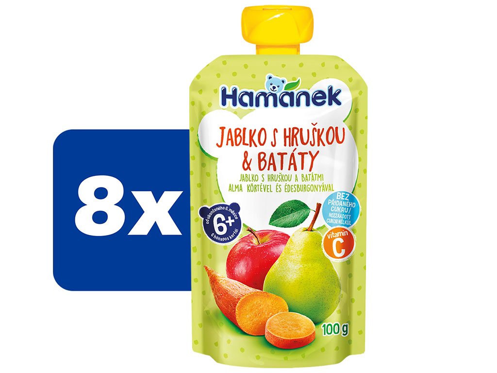 100 % ovocno-zeleninová svačinka bez přidaného cukru a s vitamínem C pro nejmenší. Ovocný příkrm vhodný od ukončeného 6. měsíce. Bez lepku a bez přidaného cukru. Obsahuje pouze přirozeně se vyskytující cukr.