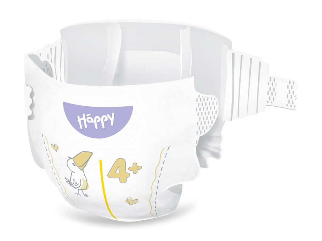 Plenky Happy Soft & Delicate Maxi Plus byly navrženy pro děti s váhou od 9 do 15 kg. Jsou lehké, tenké a prodyšné. Se superabsorbentem je pokožka miminka rychle v suchu. Jelikož je pokožka dítěte citlivá a náchylná vůči podráždění, tak je dobré vědět, kdy dítě přebalit. Indikátor vlhkosti na plenkách vám umožňuje přesně určit, kdy je třeba plenku vyměnit nebo kdy ještě není ten čas rušit dítě s výměnou plenky. Jsou neparfémované a neobsahují alergeny. Na plenách vel. 4+ vás bude doprovázet ptáček.