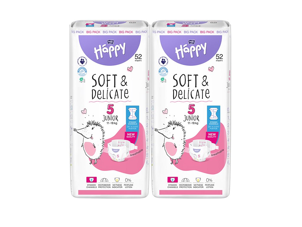 Plenky Happy Soft & Delicate Junior byly navrženy pro děti s váhou od 11 do 18 kg. Jsou lehké, tenké a prodyšné. Se superabsorbentem je pokožka miminka rychle v suchu. Jelikož je pokožka dítěte citlivá a náchylná vůči podráždění, tak je dobré vědět, kdy dítě přebalit. Indikátor vlhkosti na plenkách vám umožňuje přesně určit, kdy je třeba plenku vyměnit nebo kdy ještě není ten čas rušit dítě s výměnou plenky. Jsou neparfémované a neobsahují alergeny. Na plenách vel. 5 vás bude doprovázet mlsný ježeček.