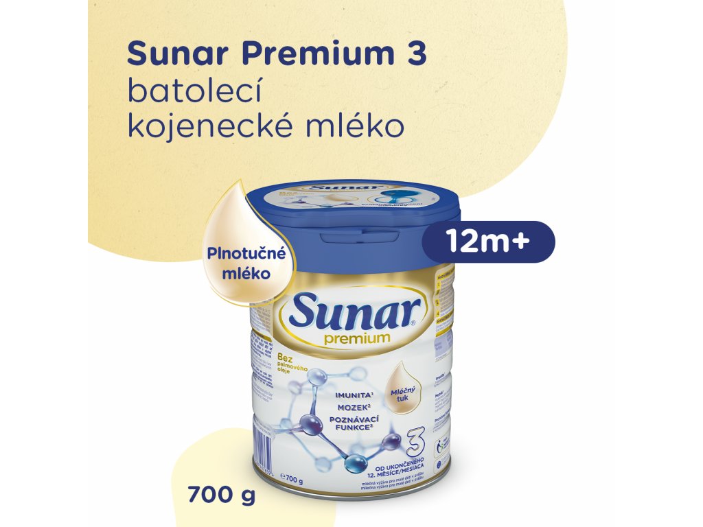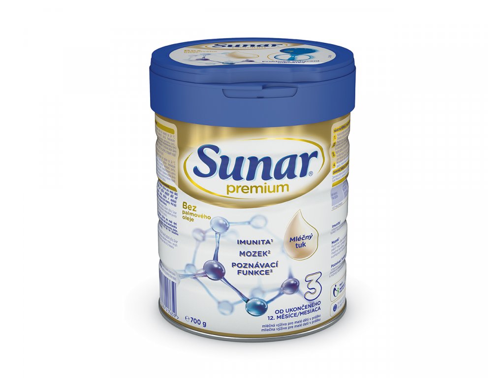 Nejlepší batolecí mléko Sunar Premium 3 s ještě vyšším obsahem mléčného tuku a bez palmového oleje. Je přizpůsobeno speciálním potřebám batolat, proto obsahuje více důležitých živin než kravské mléko.
