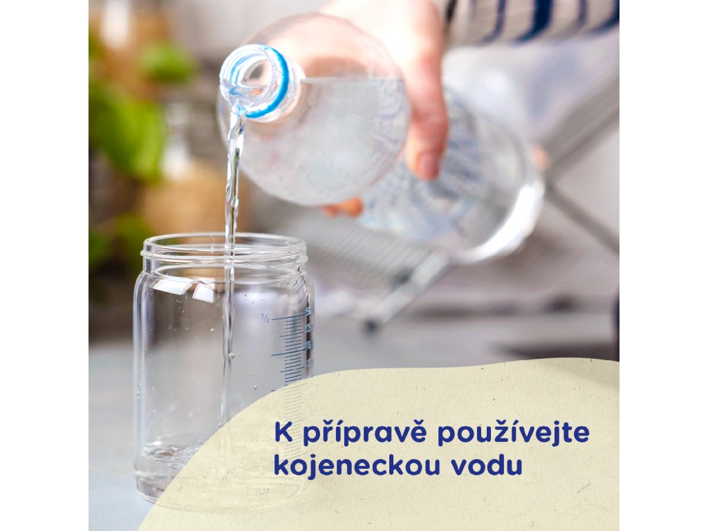 2. Převařenou vodu vychlaďte na 40 °C (V jiné nádobě převařte pitnou vodu vhodnou pro kojence a nechte ji vychladnout např. ve vodní lázni na 40 °C. Vlijte požadované množství do vysterilizované lahve (dávkování viz tabulka). Nespotřebovanou převařenou vodu již pro další přípravu mléka nepoužívejte.)