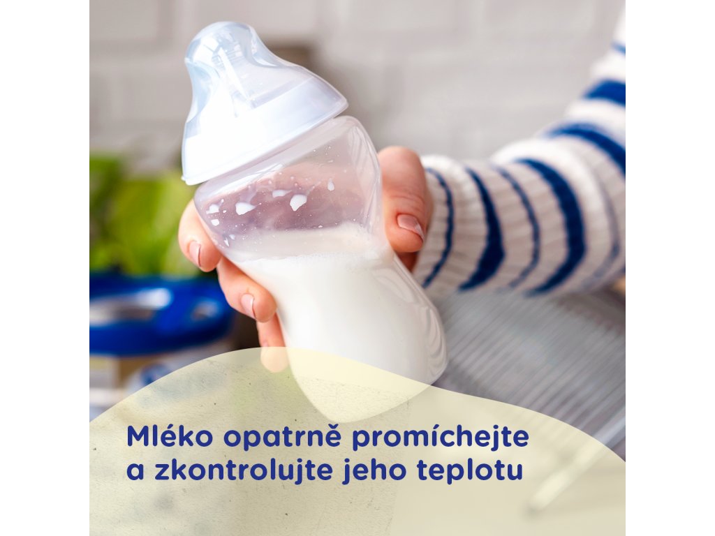 4. Protřepte a zkontrolujte teplotu (Před podáváním dítěti si zkontrolujte na vnitřní straně zápěstí, že teplota mléka není vyšší než 37–40 °C. Připravenou porci ihned podávejte.)