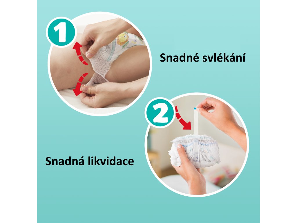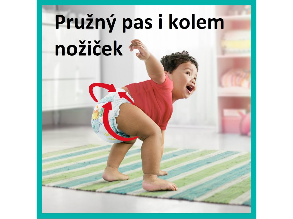 Plenkové kalhotky Pampers navržené pro aktivní děti jsou perfektní, když jsou děti zvídavé a při přebalování se vám pořád otáčí nebo plazí pryč, protože je nemusíte zapínat, nebo když je chcete začít učit chodit na nočník a zvykat si na spodní prádlo. Plenkové kalhotky s pohodlným pružným pasem pro 12hodinový pocit sucha se snadno natahují a poskytují dětem svobodu a pohodlí. Absorpční kanálky rychle odvádí tekutinu od pokožky do jádra pleny. Dvojité manžetky kolem nožiček poskytují skvělou ochranu proti protečení.