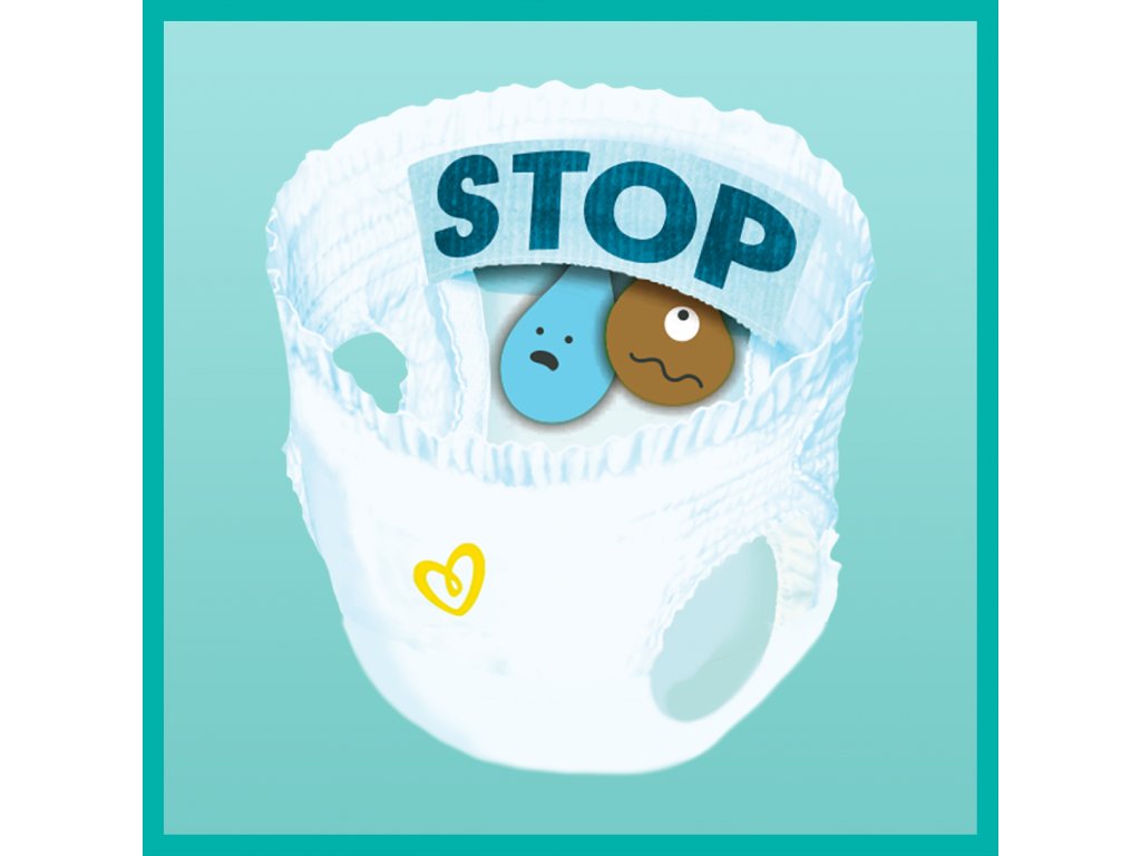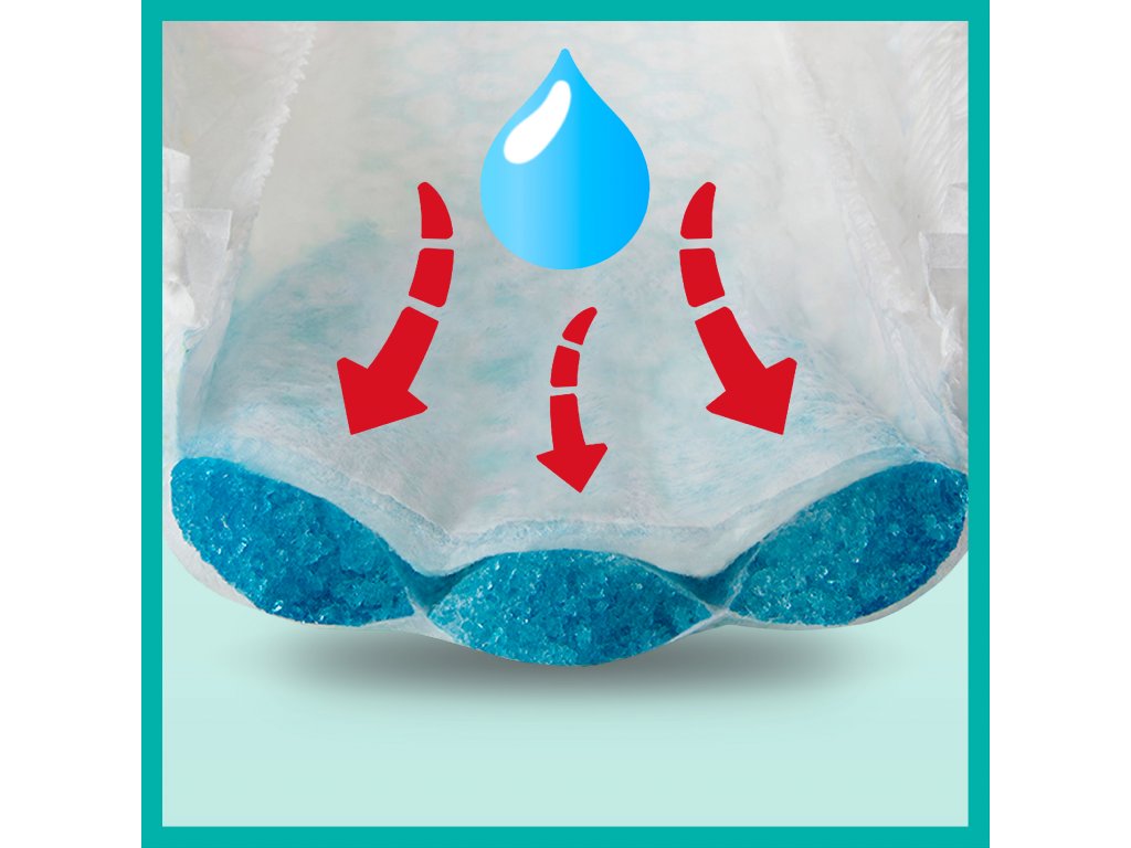 Až 12hodinová úplná ochrana proti protečení díky Kapsy Stop & Protect, supersbsorpčnímu jádru a dvojitým manžetkám kolem nožiček - Kapsa pomáhá předcházet protečení vzadu a manžetky předcházejí protečení kolem nožiček. Jádro okamžitě absorbuje tekutinu a odváví ji daleko od pokožky miminka.