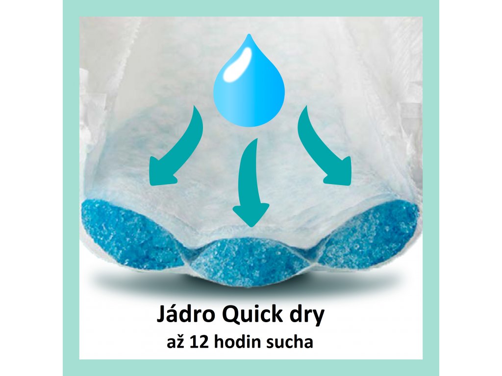 Jádro Quick dry - Okamžitě absorbuje tekutinu, aby vaše děťátko zůstalo v suchu a chráněné po dobu až 12 hodin.