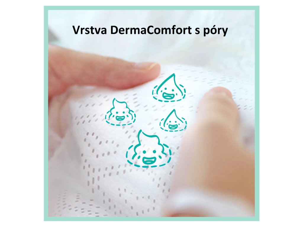 Exkluzivní vrstva DermaComfort - Vrstva DermaComfort s absorpčními póry, kteé odvádějí vlhkost a nečistoty od pokožky a uzavírají je uvnitř plenky.